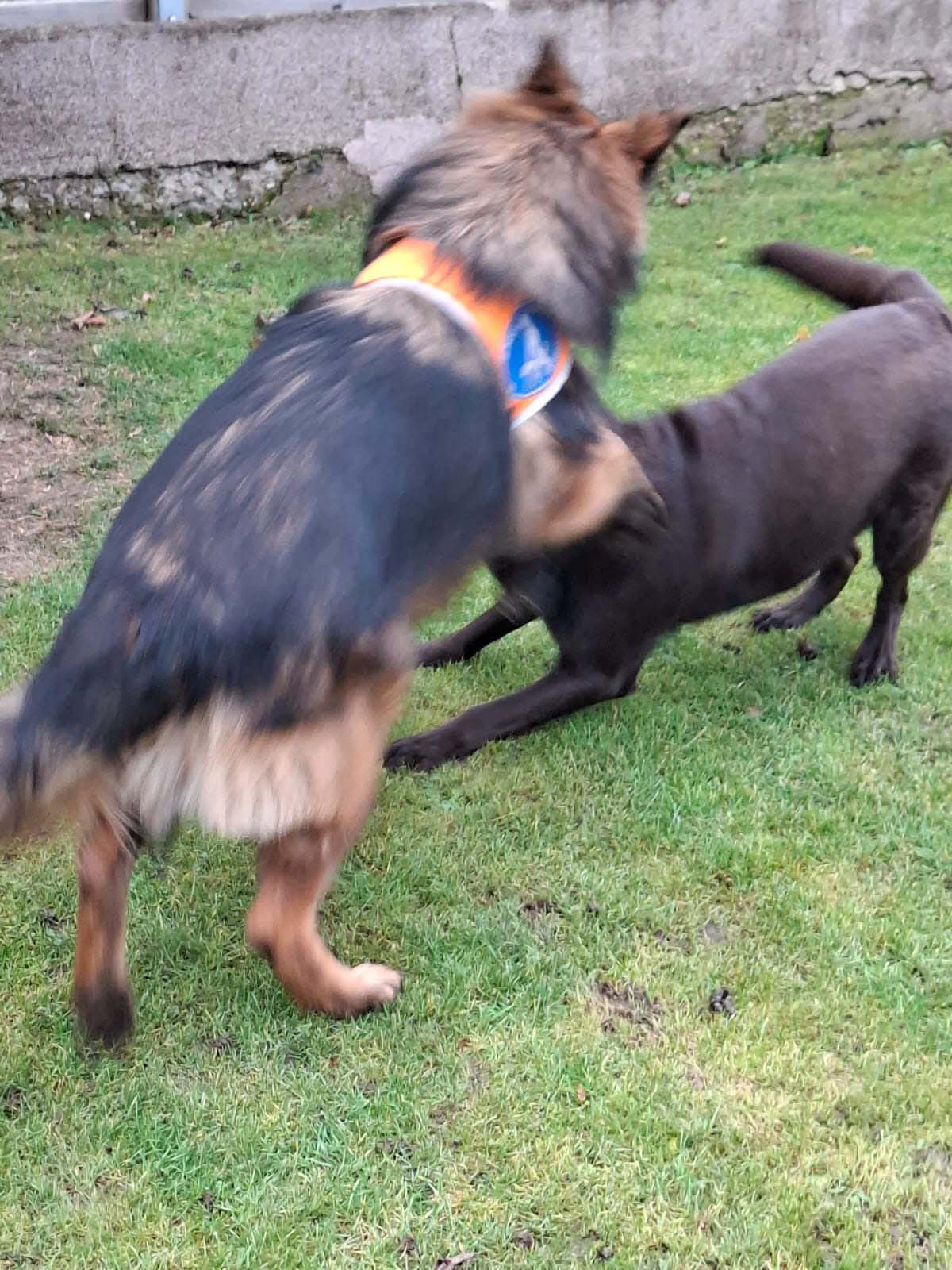 Foto 4: Die beiden Blindenführhunde von Frau Damm und Frau Freund toben auf einer Wiese.