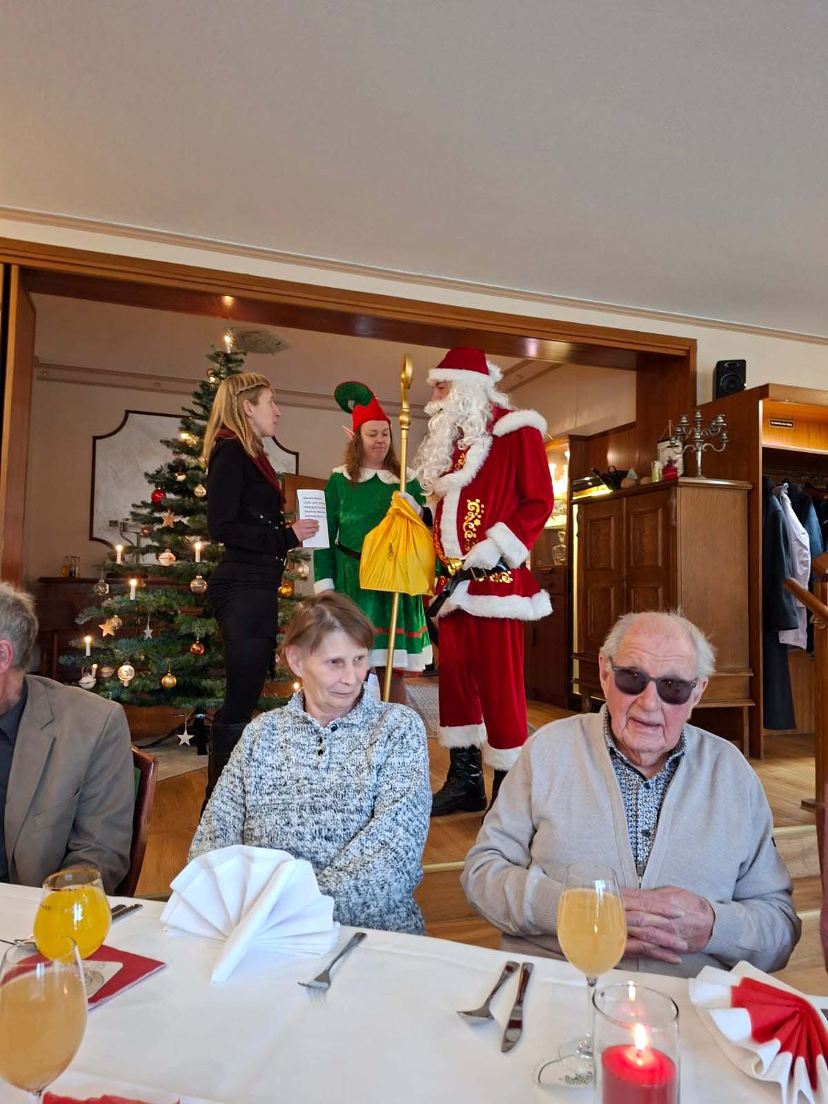Foto 1: Frau Damm steht dem Nikolaus gegenüber, neben ihm steht eine helfende Elfe. Im Hintergrund ist ein geschmückter Weihnachtsbaum, im Vordergrund die Gäste an der weihnachtlich gedeckten Tafel.