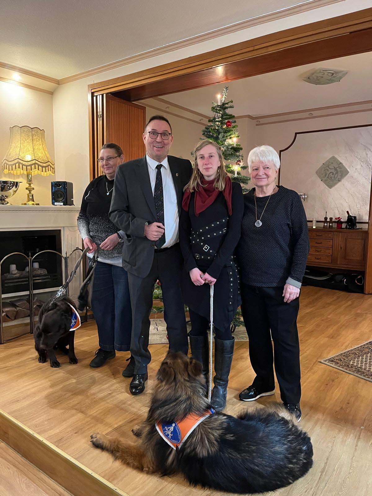 Foto 3: Elke Freund mit ihrem Blindenführhund, stellv. Landrat Stefan Ohrmann, Katharina Damm mit ihrem Blindenführhund und Barbara Cliffe (von links).