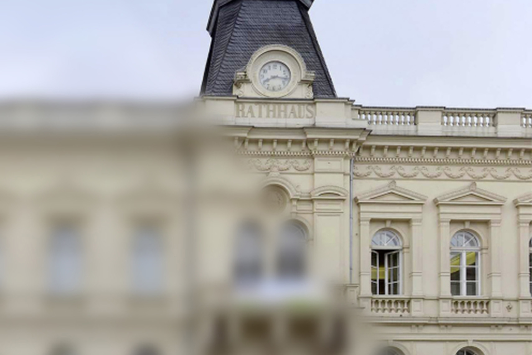 Altes Rathaus von Iserlohn – links in der Darstellung mit der Seheinschränkung eines gesetzlich blinden Menschen, rechts aus der Perspektive einer normal sehenden Person -