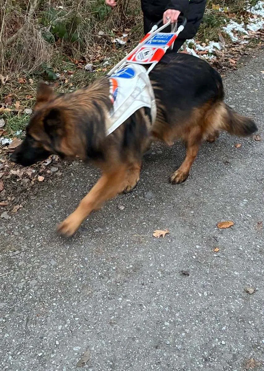 Spaziergang mit Blindenführhund in weißem Führgeschirr -